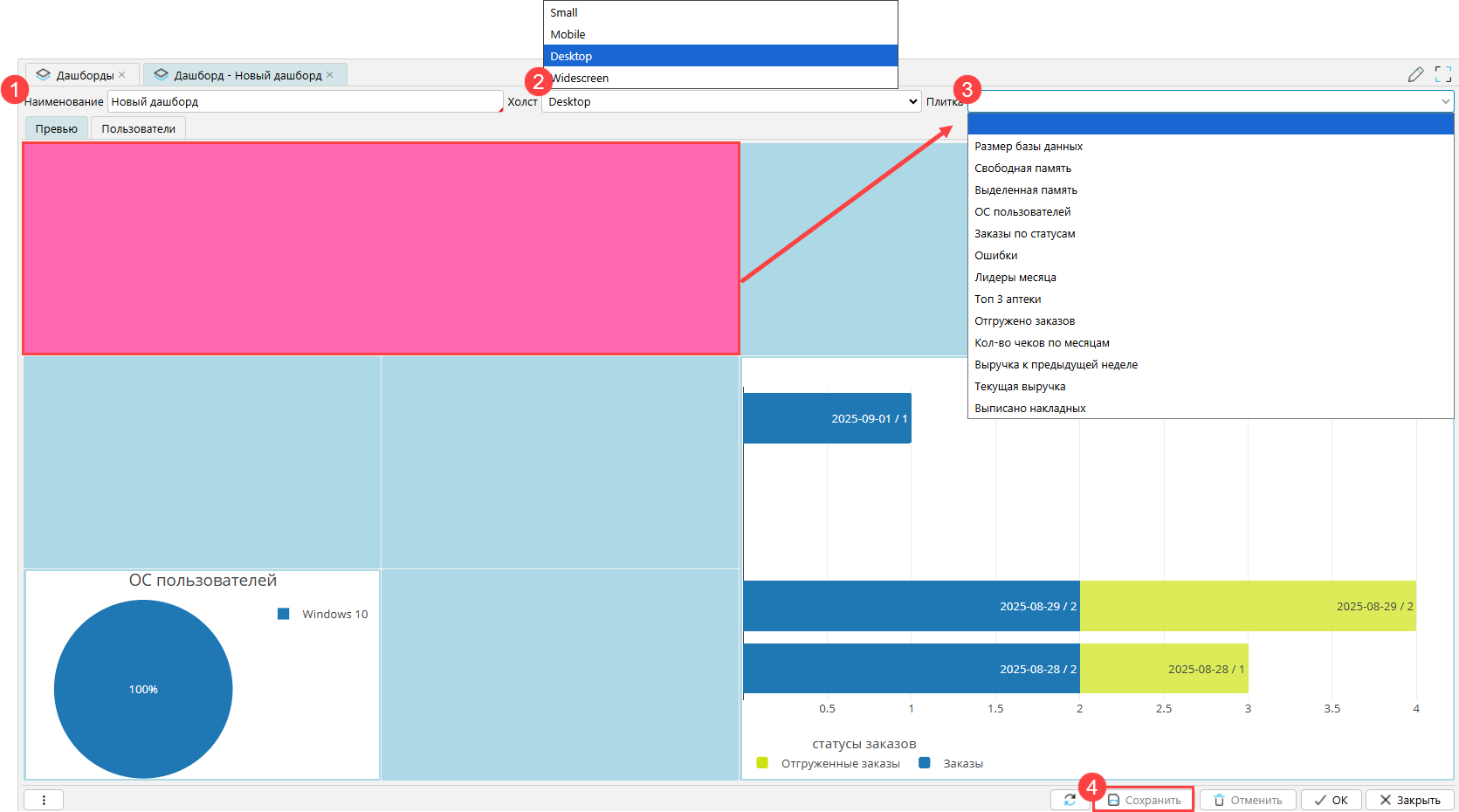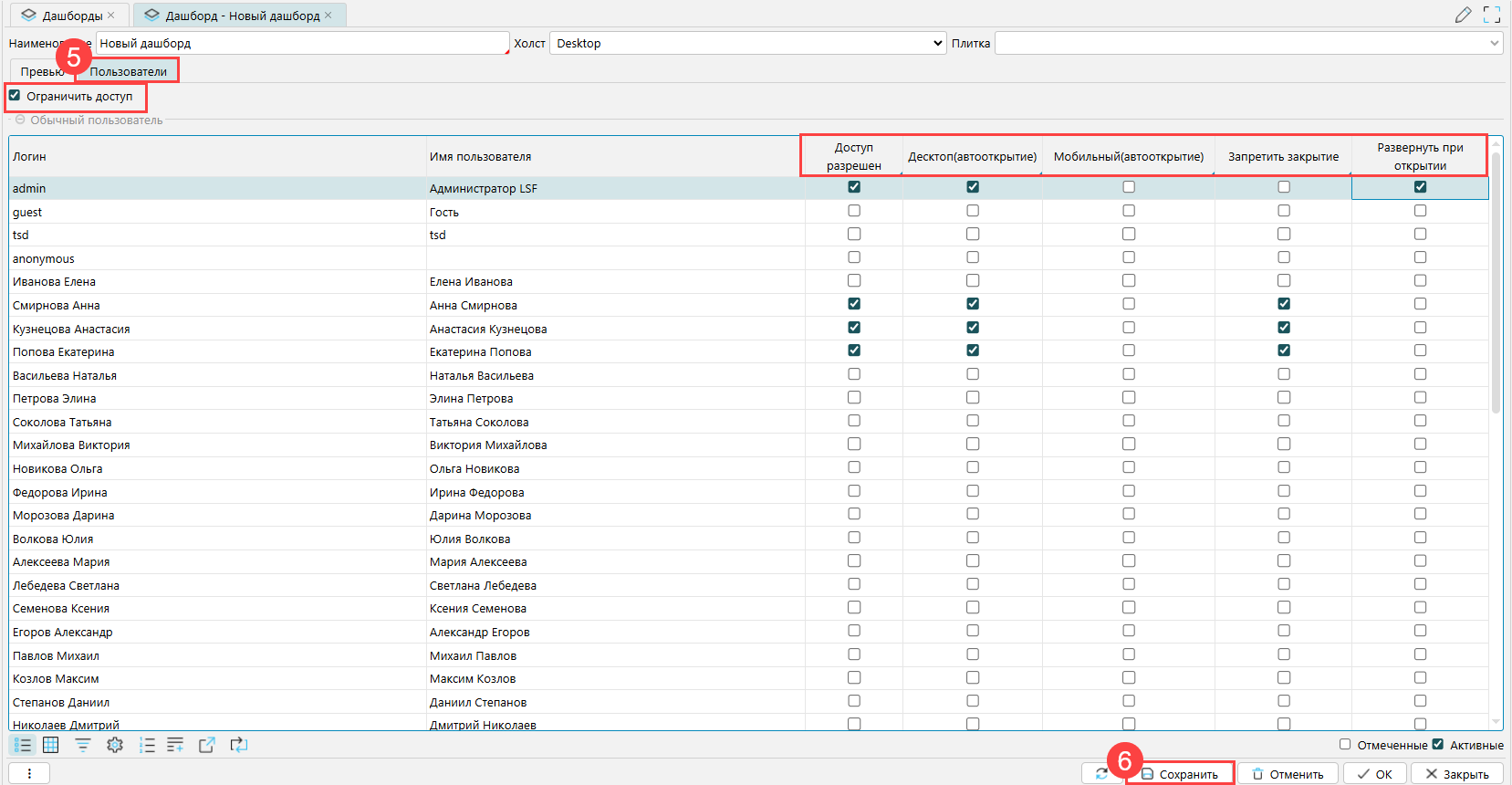• Десктоп (автооткрытие) - если для пользователя отмечено флажком это свойство, то при входе в систему на десктоп устройстве дашборд откроется для просмотра.