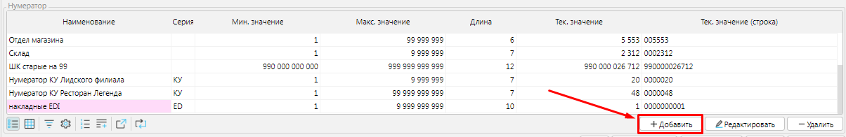 Здесь представлен список существующих нумераторов, можно их редактировать и создавать новые.