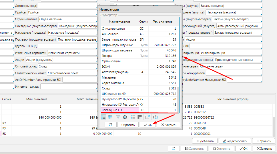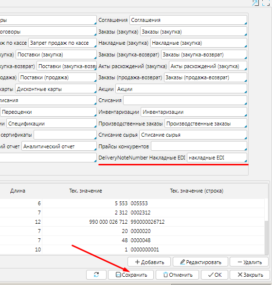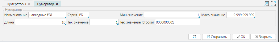 Чтобы назначить нумератор для объекта, необходимо кликнуть в поле соответствующего объекта, например DeliveryNoteNumber НакладныеEDI для формирования номера электронных накладных, в открывшемся окне выбрать соответствующий нумератор и нажать ОК (рис. 2). Если необходимого нумератора нет, его надо создать. Внесенные на форме изменения необходимо сохранить (рис. 3).