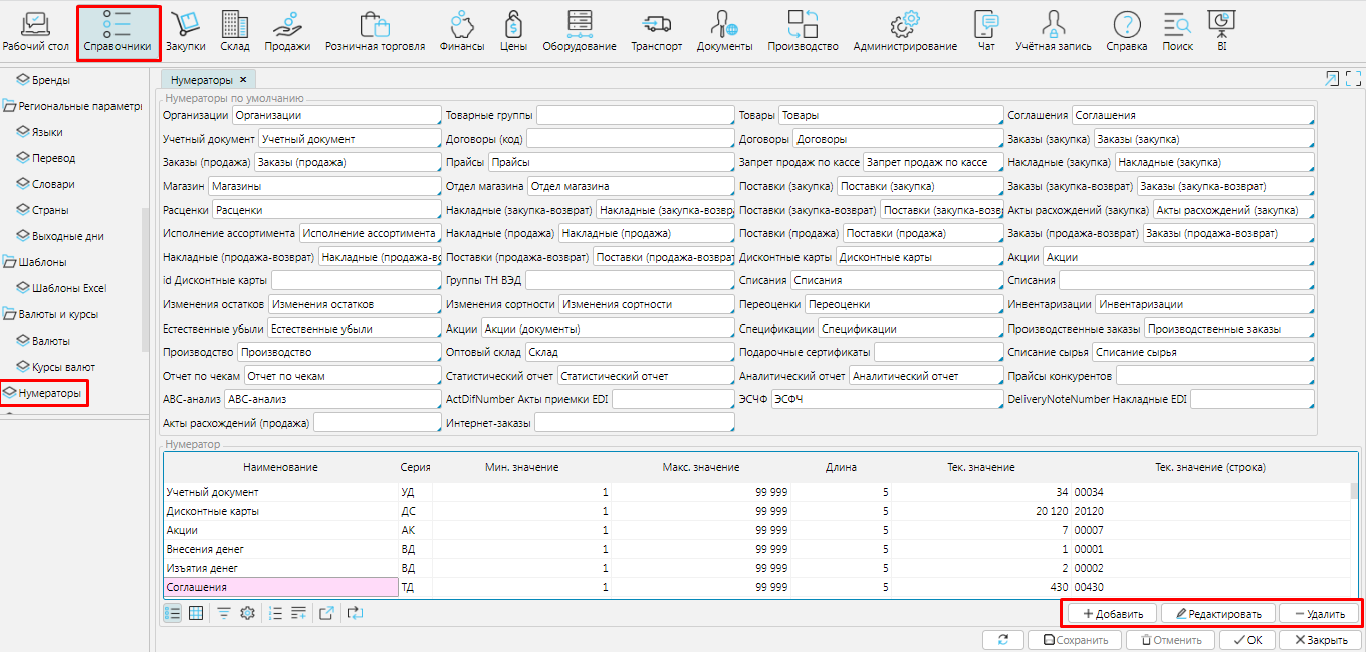 Форма Справочники - Нумераторы предназначена для просмотра и редактирования информации о нумераторах.