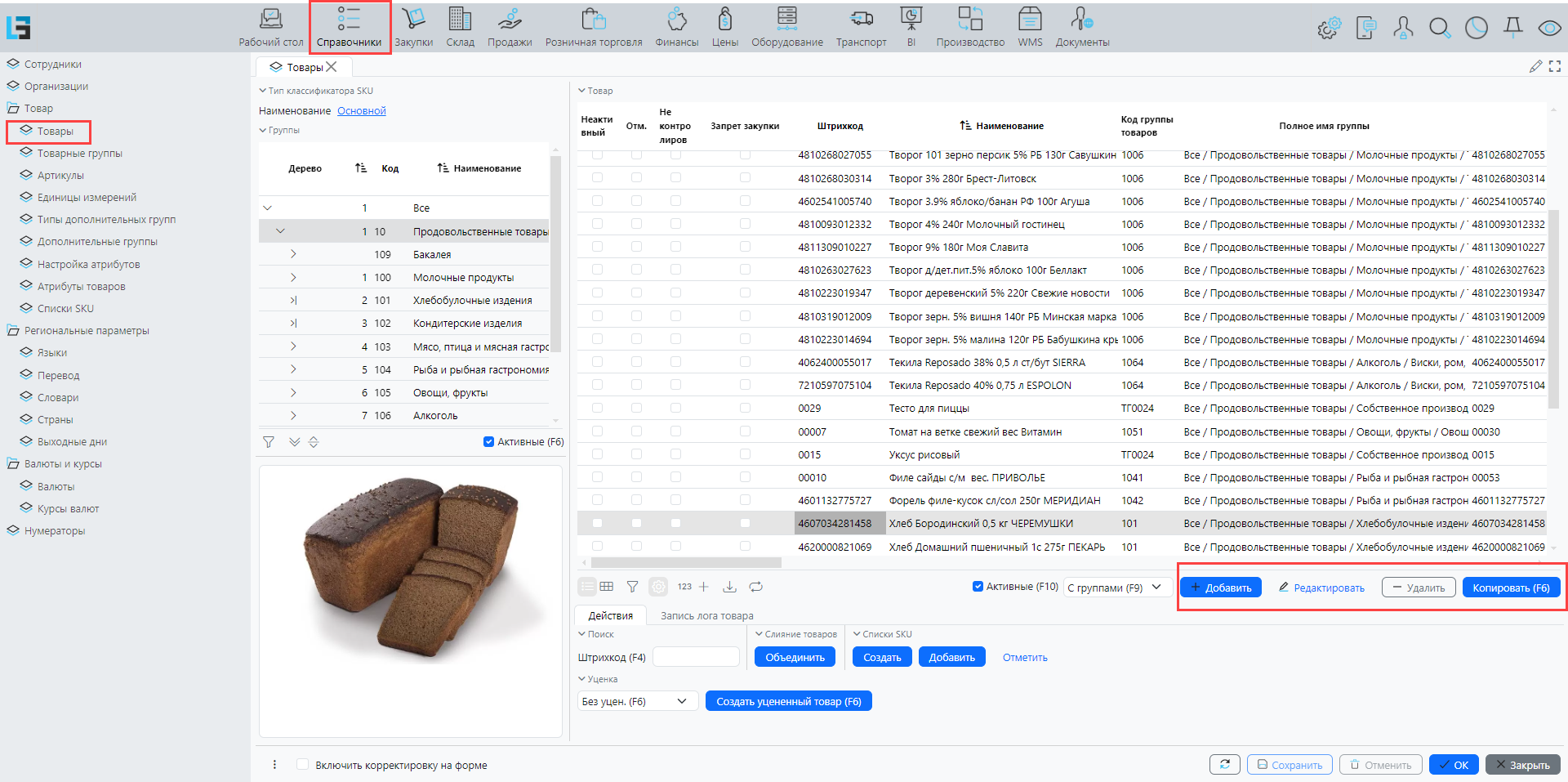 Чтобы открыть карточку товара, необходимо в Справочники - Товары дважды кликнуть на нужный товар, или выделить его и нажать кнопку Редактировать. Если нажать кнопку Добавить, вы создадите новый товар (откроется пустая карточка товара для заполнения).  Кнопка Копировать создает копию выбранного товара, это позволяет быстро создать новый товар со схожими характеристиками, вам остается лишь поменять некоторые данные и сохранить карточку.