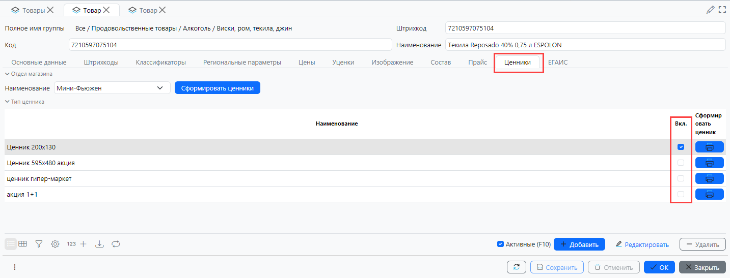 Здесь отображаются все ценники, которые настроены в системе. В колонке Вкл. отмечают ценники, которые используются по умолчанию для товара. отсюда можно сформировать ценники для печати по отдельности нажав на кнопку Сформировать ценник или все сразу по кнопке Сформировать ценники. Будут сформированы ценники с указанием цен по выбранному складу/магазину. Подробнее о ценниках и этикетках.