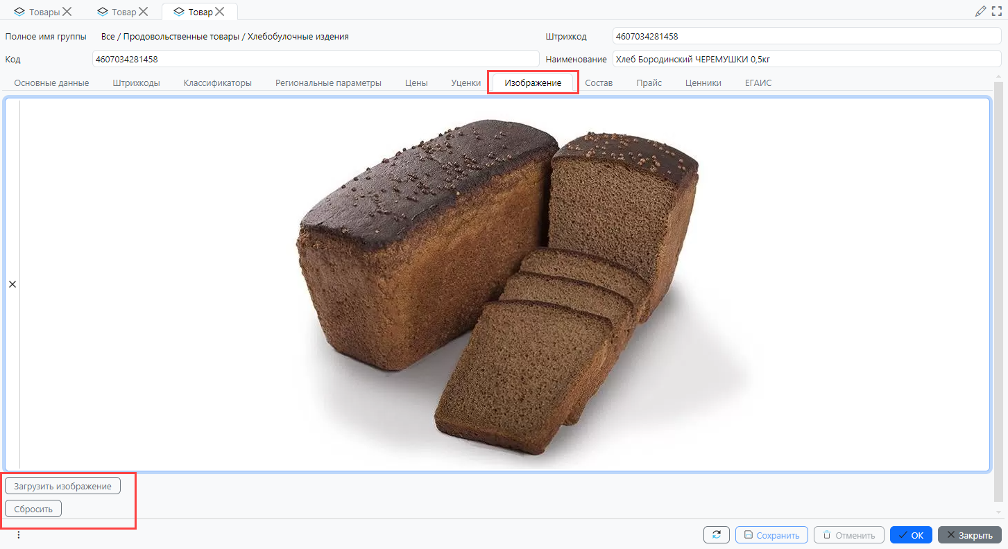 На вкладке Изображение можно загрузить изображение товара, которое будет видно в справочнике при выборе товара, может быть передано на ТСД, прайс-чекер и в другое оборудование, выгружено на сайт и т.д. Для загрузки используют команду Загрузить, для удаления загруженного изображения - команду Сбросить