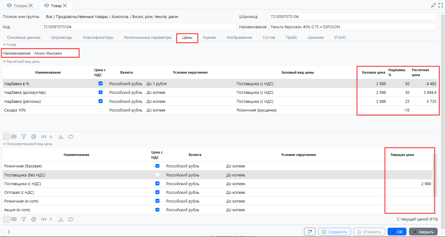 На вкладке Цены перечислены все цены расчетного и пользовательского вида. Если для текущего товара были созданы прайсы (вкладка Прайс), то в блоке Пользовательский вид цены, в колонке Текущая цена будут значения из прайсов. Если для товара существует Базовая цена, то отобразится Расчетная цена, как результат умножения Базовой цены на % надбавки. Признак Цена с НДС указывает, что в Расчетную цену также добавлен НДС. Цены отображаются относительно выбранного склада/магазина.