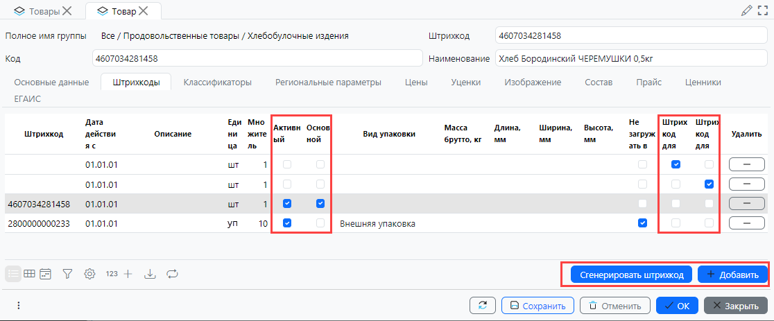 Для товара поддерживаются множественные штрихкоды, которые  можно просмотреть на вкладке Штрихкоды, добавить новые или деактивировать неактуальные.