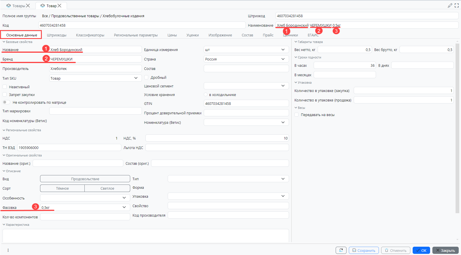 На вкладке  Основные данные указаны базовые свойства, такие как Название, Бренд, Производитель, Единица измерения, Поставщик и т.д. Какие из доступных в программе атрибутов товара будут отображаться и настраиваться в карточке товара определяют настройки на уровне товарной группы, а также подключенные модули.