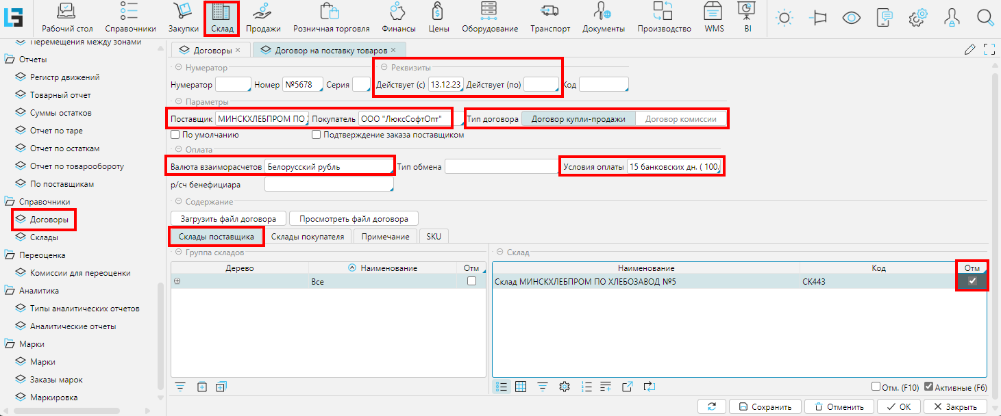 - Склады покупателя. Отмечаются склад (склады) покупателя, на который будет приниматься товар.