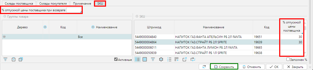 - SKU. Если поставщик принимает возвращаемый товар по цене, меньше поставленной, то указывается процент скидки: либо на весь товар поставщика, либо на отдельные товары (рис.2).