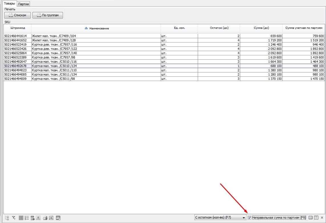 Делаем проверку расхождений учетных сумм (всего и по партиям) в левой части формы