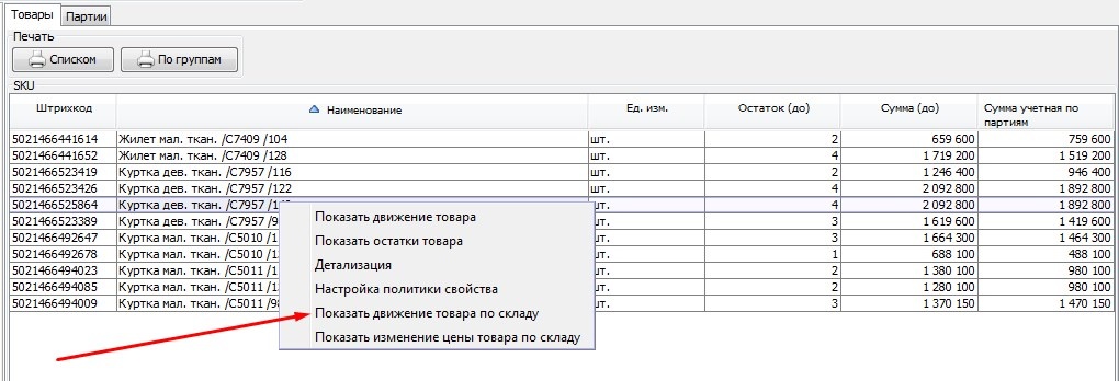 (опять же по нажатию правой кнопки мыши и выборе "Движение по складу") и внести исправление по количеству перемещаемого товара.