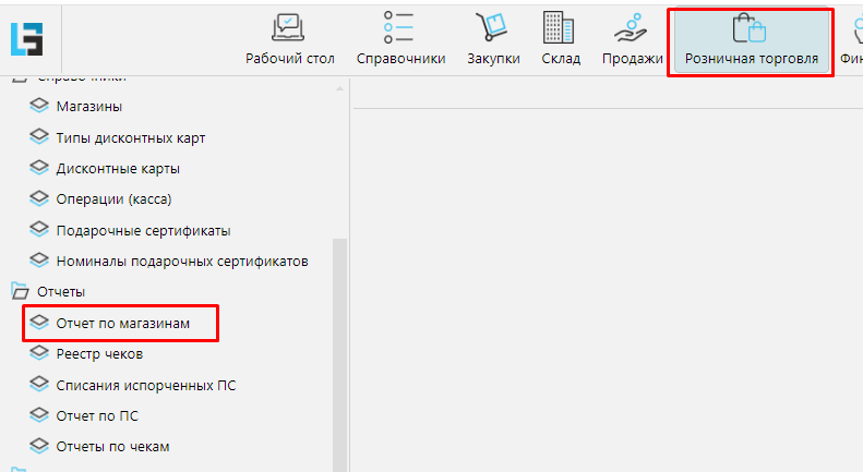 Заходим на форму "Отчет по магазинам" (модуль "Розничная торговля" раздел "Отчеты")
