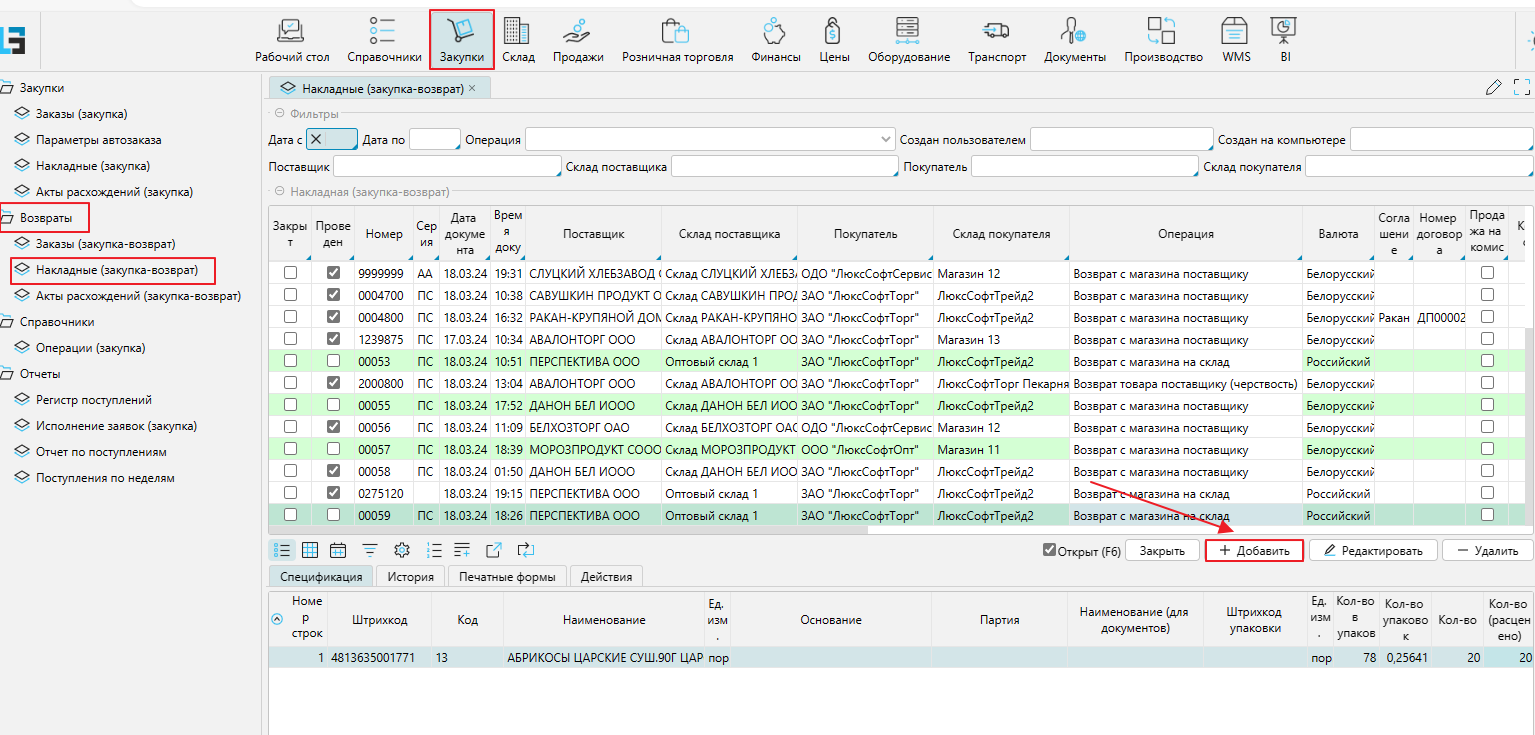 В открывшейся форме Накладные (закупки-возврат) нажимаем кнопку "Добавить".