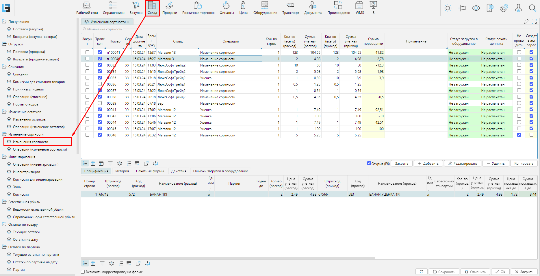 Управление документами изменения сортности осуществляется на форме Склад - Изменения сортности: