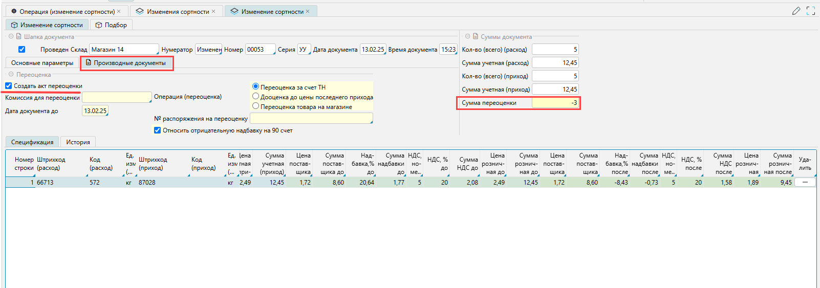 Документ "Изменение сортности" служит для возможности осуществления изменения сортности товарных позиций на торговом объекте. Чаще всего изменение сортности используется для уценки товаров. Однако это не единственный вариант, изменение сортности может использоваться и наоборот, для повышения сорта товара. Также документ может использоваться для других операций, в которых списывается исходный товар, а на приход становится "новый". Особенности изменения сортности маркированного товара описаны в статье Изменение сортности маркированного товара.