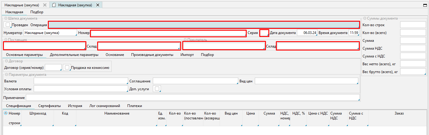 Если мы находились в закладке Подбор, то необходимо вернуться в закладку "Накладная" и сверить суммы в области "Суммы документа" с суммами в ТТН.