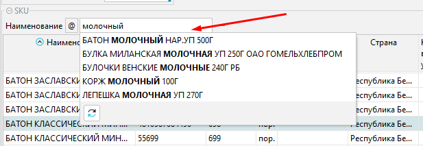 После нажатия кнопка, появится новая строка, для заполнения которой надо в колонке Наименование внести фрагмент названия товара и выбрать необходимый товар.