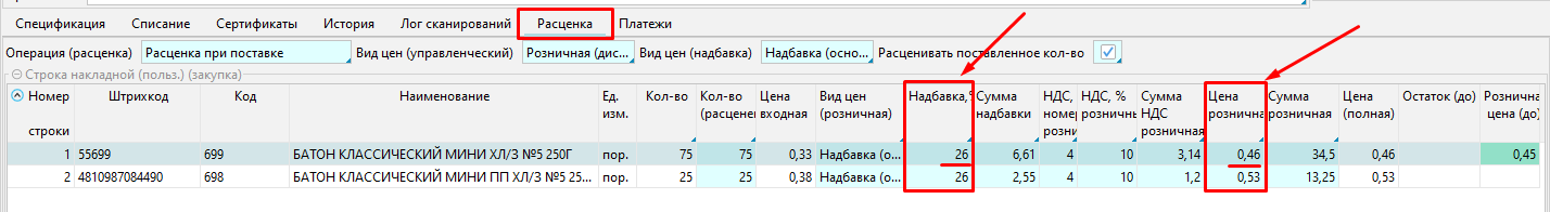 Для произведения операции расценки товара нам необходимо перейти в закладку расценка.
