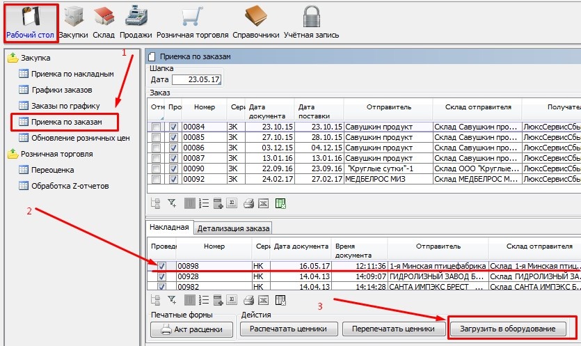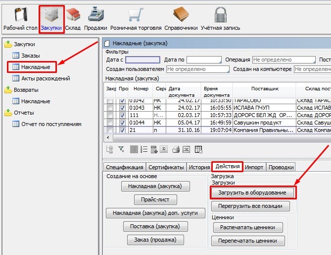 После проведения приходного документа на форме "Накладные" (Закупки) в закладке "Действия" используется кнопка "Загрузить в оборудование".