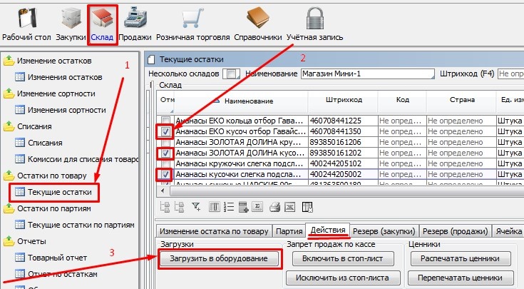 Загрузка в оборудование (кассы и весы) производится из многих форм системы,