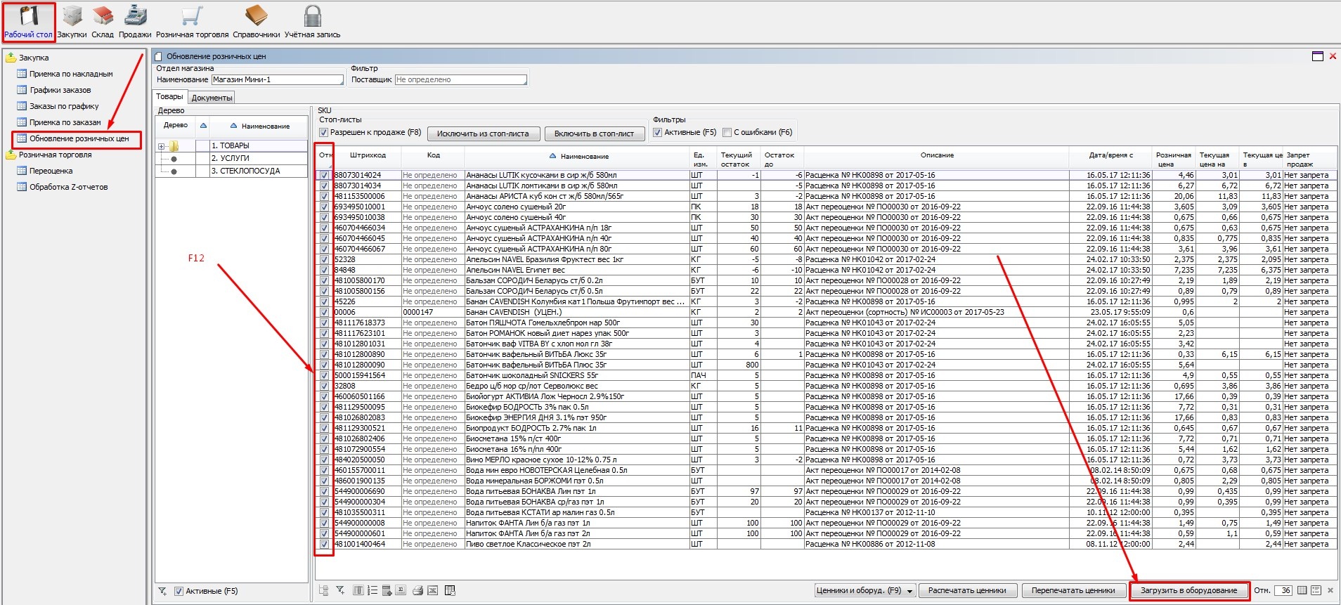 Для загрузки в оборудование необходимо отметить галочкой нужные позиции (либо все позиции групповой корректировкой по кнопке F12).