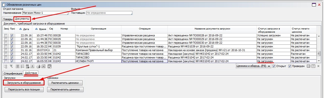 по которым после проведения не было загрузки в оборудование или не осуществлялась печать ценников.