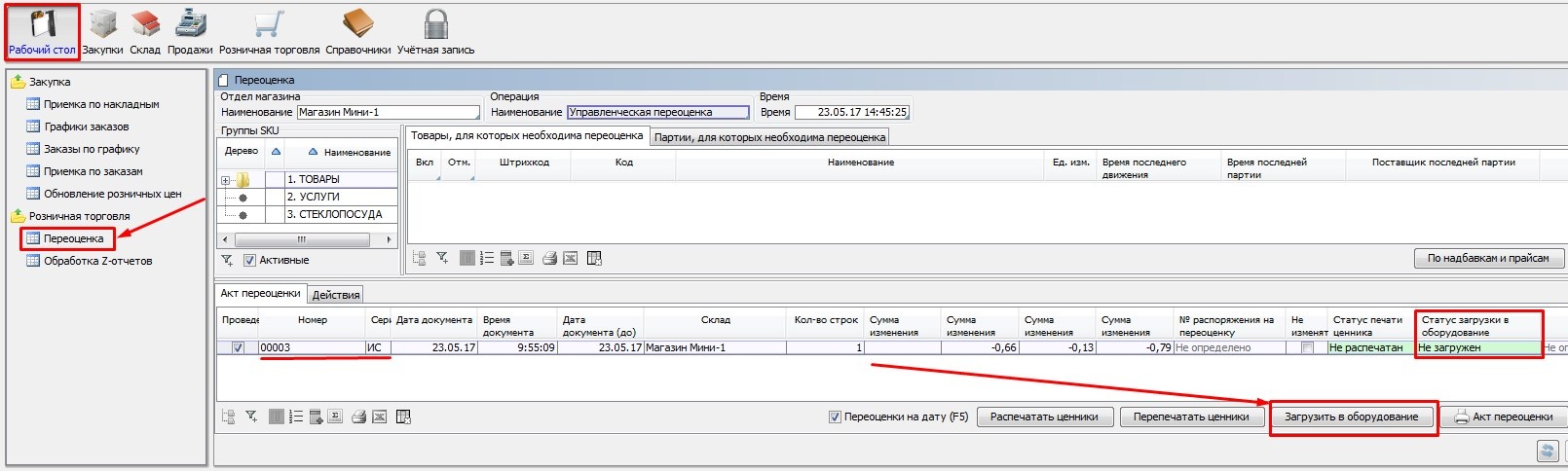 После проведения переоценки необходимо загрузить новые цены в весы и кассы по соответствующей кнопке "Загрузить в оборудование".