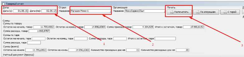 На форме имеется возможность распечатать товарный отчет в разрезе операций по кнопке «По операциям», а так же отчет по таре.