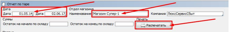 Заходим на форму «Отчет по таре» модуль Склад раздел Отчеты.