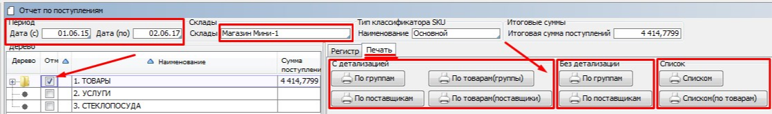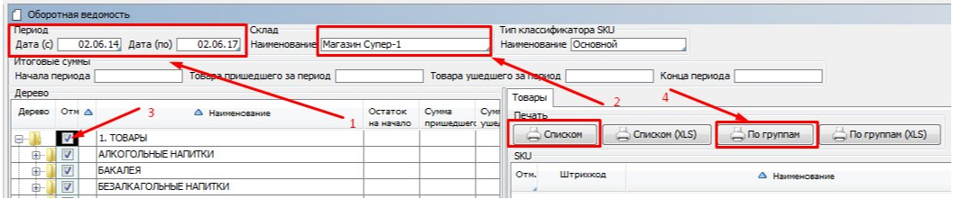 Выбираем Диапазон дат. Выбираем Склад. В дереве Классификатора отмечаем Группу товаров или все Товары.