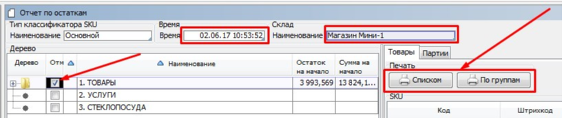 Выбираем Дату. Выбираем Склад. Отмечаем Группу товаров. Нажимаем кнопку «Списком» или «По группам».