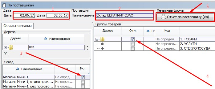 Заходим на форму «По поставщикам» модуль Склад раздел Отчеты.