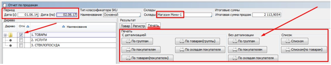 Заходим на форму Отчет по продажам модуль Продажи раздел Отчеты.