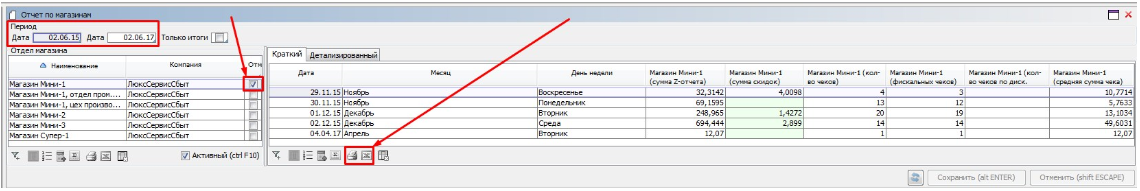 Выбираем Период. Отмечаем Склад(Отдел магазина). Нажимаем кнопку Печати таблицы либо Экспорта в Эксель.