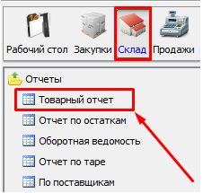 Заходим на форму «Товарный отчет» модуль Склад раздел Отчеты.