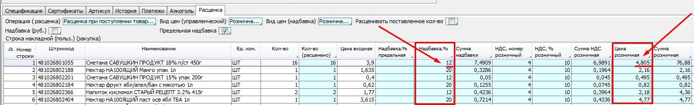 *Примечание: Для формирования розничной цены мы можем изменять надбавку либо вручную внести цену розничную, тогда надбавка рассчитается автоматически.