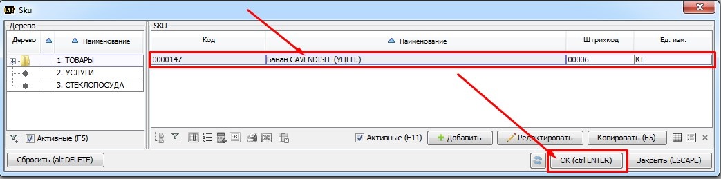 - Выбираем наименование товара, на который будет перевешена та часть остатка товара, подлежащая уценке (Например, Банан (Уцен.))