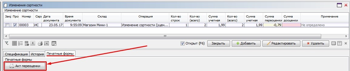 - После проведения печатаем Акт переоценки по соответствующей кнопке в закладке "Печатные формы"