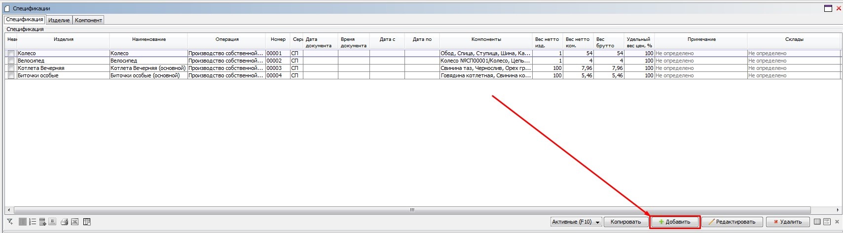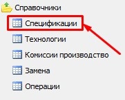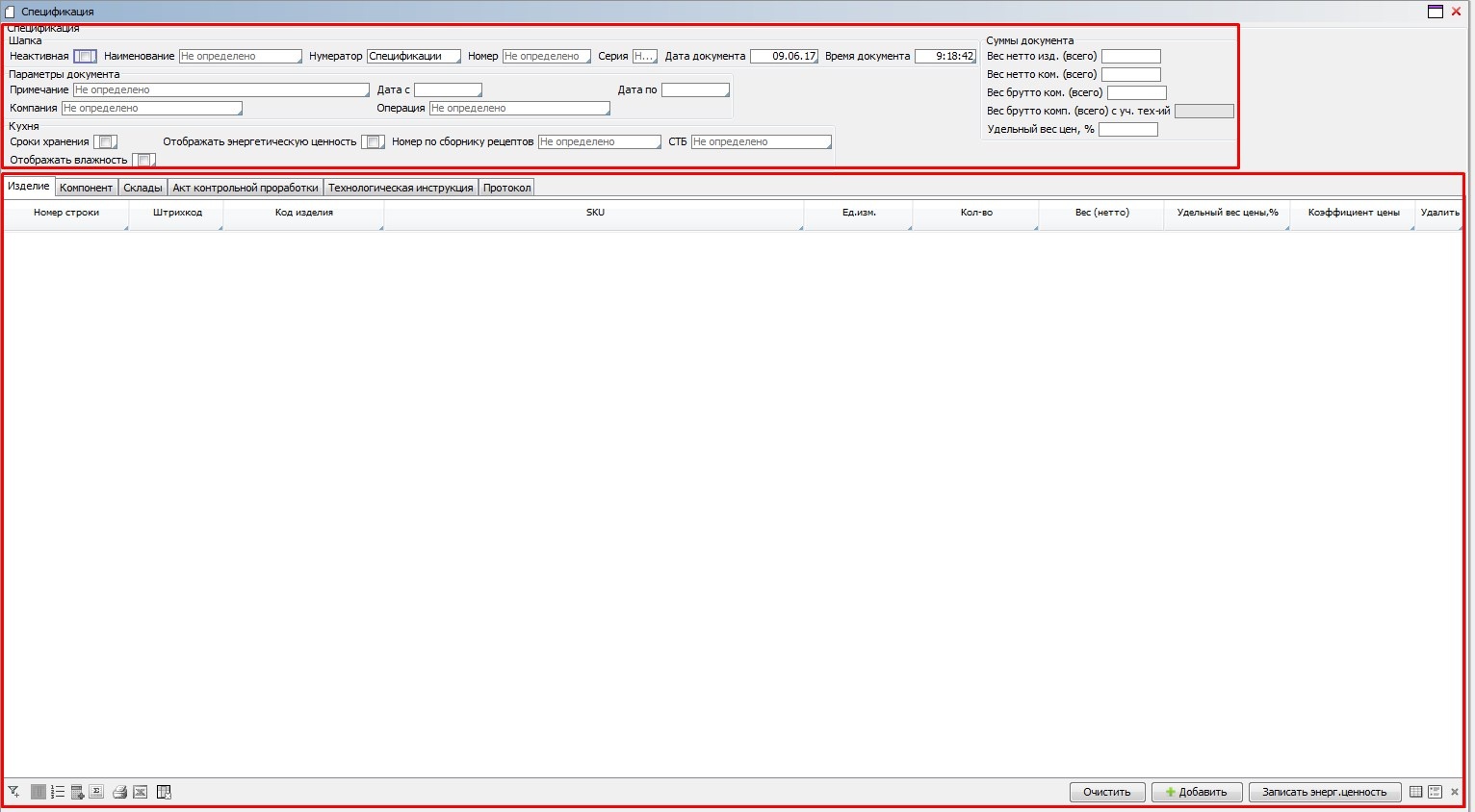 Форма Спецификации содержит в себе список технологических карт, рецептов, спецификаций, а так же информацию об изделиях и компонентах