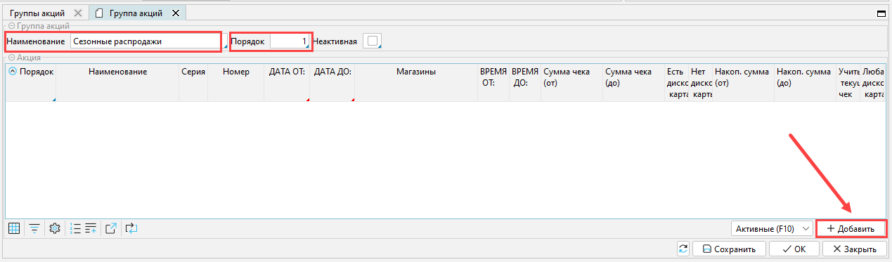Вносим "Наименование" группы акции, например "Сезонные распродажи"