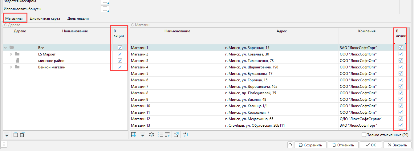 Далее отмечаем ниже те магазины, в которых будет действовать акция