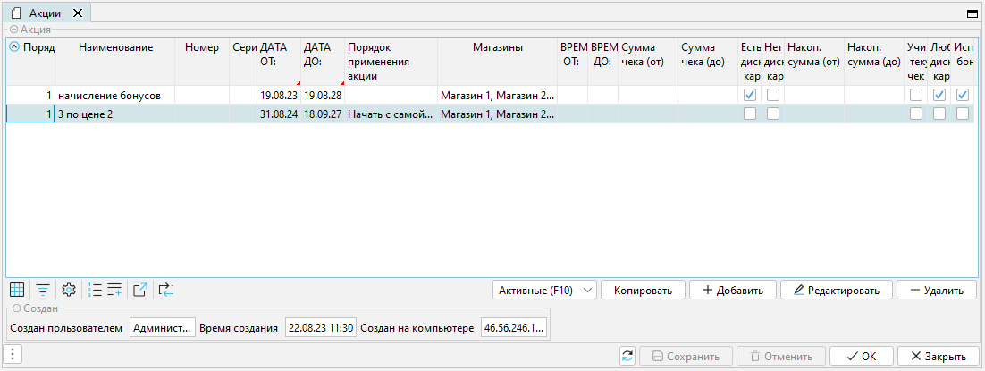 В итоге у нас на форме Акции появится акционный документ, который вступит в силу в указанную дату начала акции