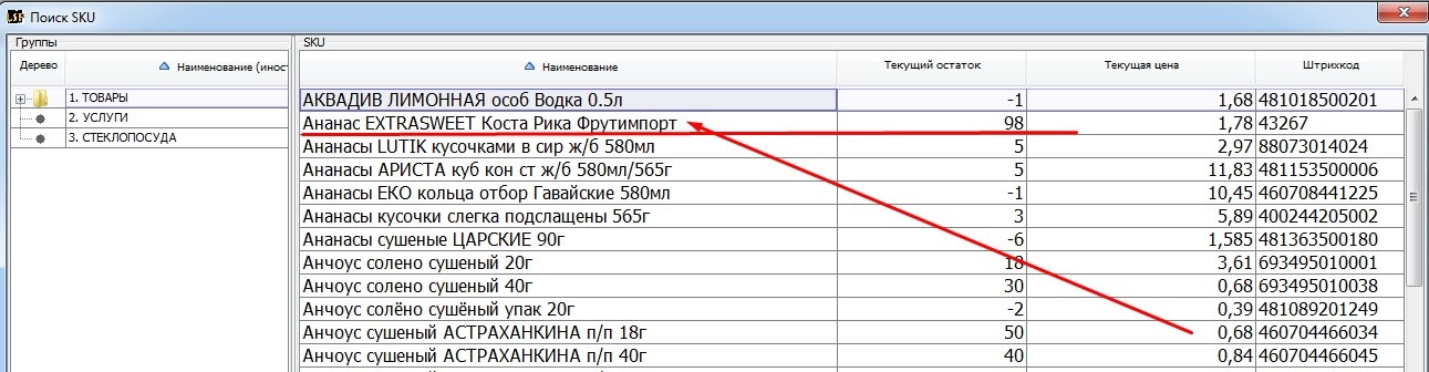 При ручном Поиске (F3) откроется окно со списком товаров .