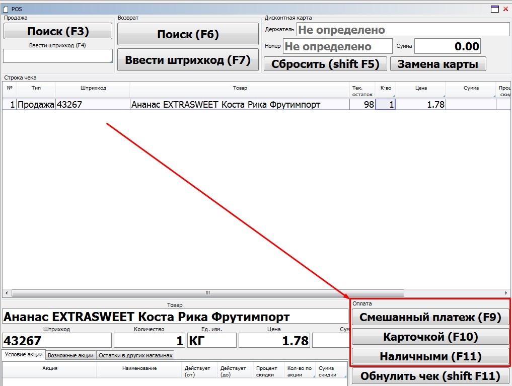 1. С помощью сканера штрих кода: товар подносим к сканеру штрих-кода и с его упаковки считывается штрих-код. Идентифицированный таким образом товар автоматически появляется в окне чека в количестве одной штуки. Если штрих-код сформирован весами, то количество товара будет соответствовать количеству, указанному в штрих-коде.