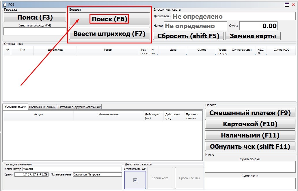 Для возврата товара следует нажать кнопку Поиск (F6) в разделе «Возврат»