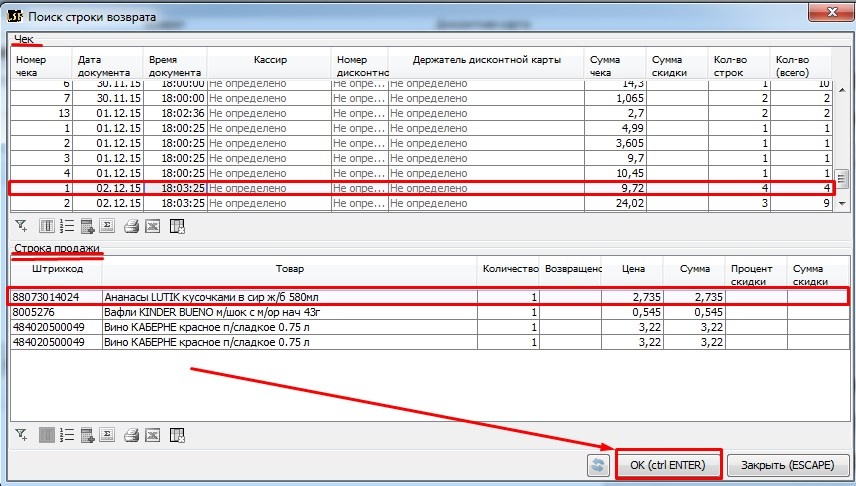 В открывшемся окне необходимо выполнить поиск чека и позиции в чеке