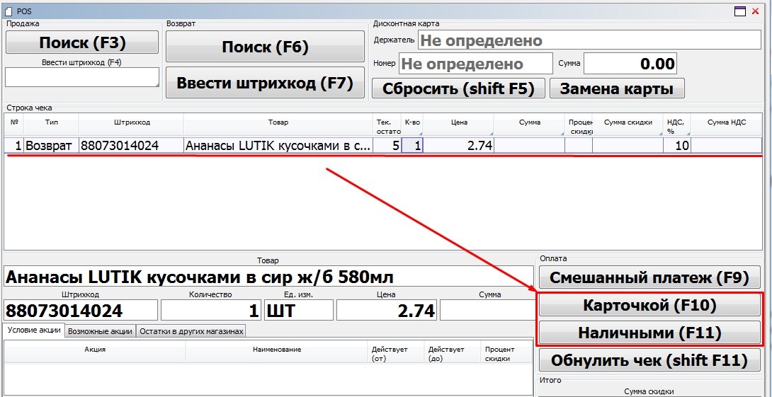 На форме POS отобразится информация о возвратной позиции. Далее необходимо выбрать способ возврата денежных средств