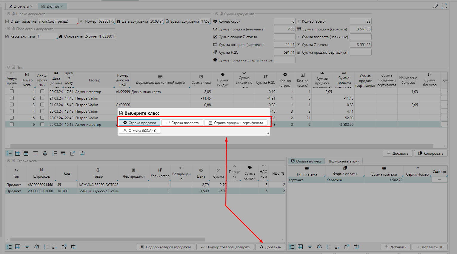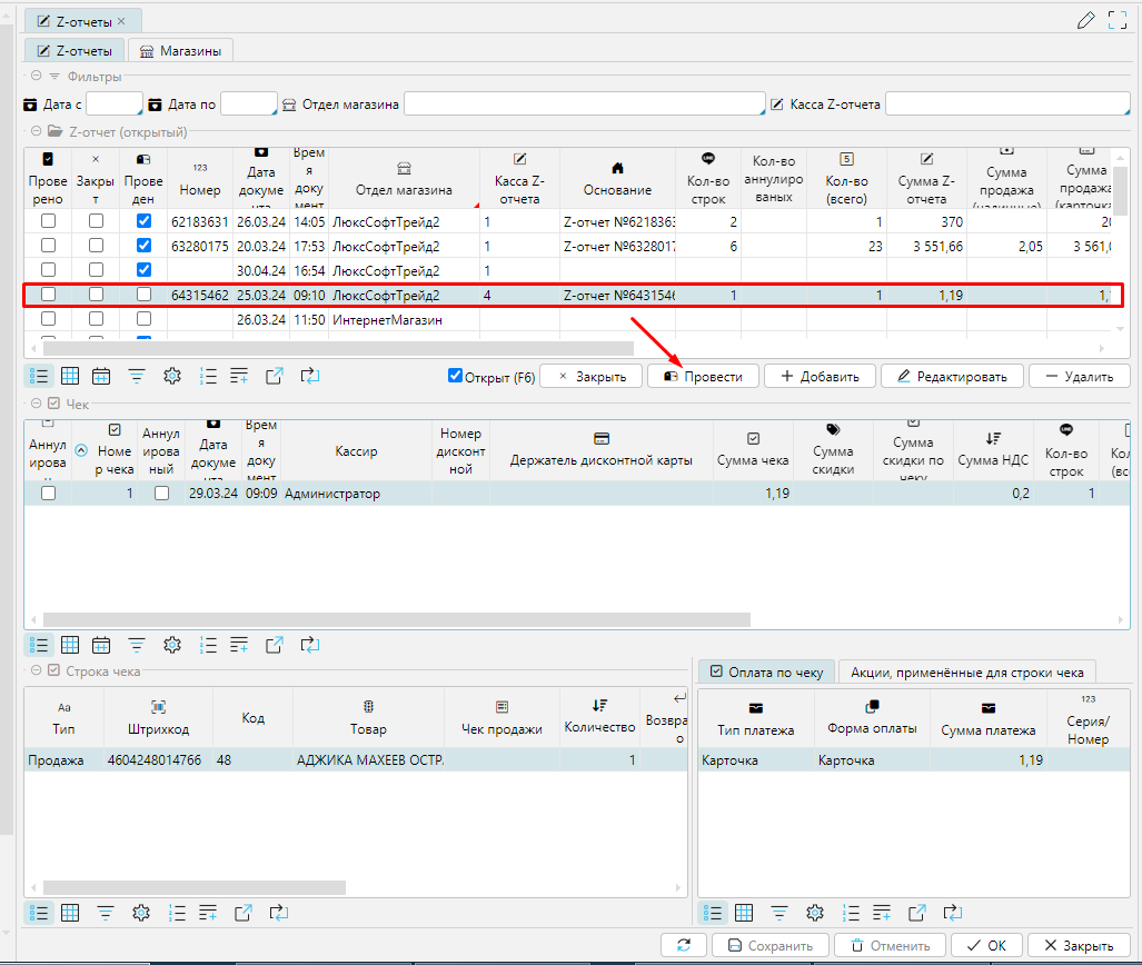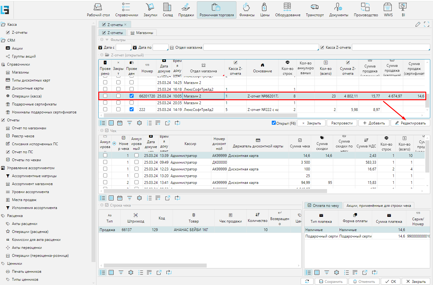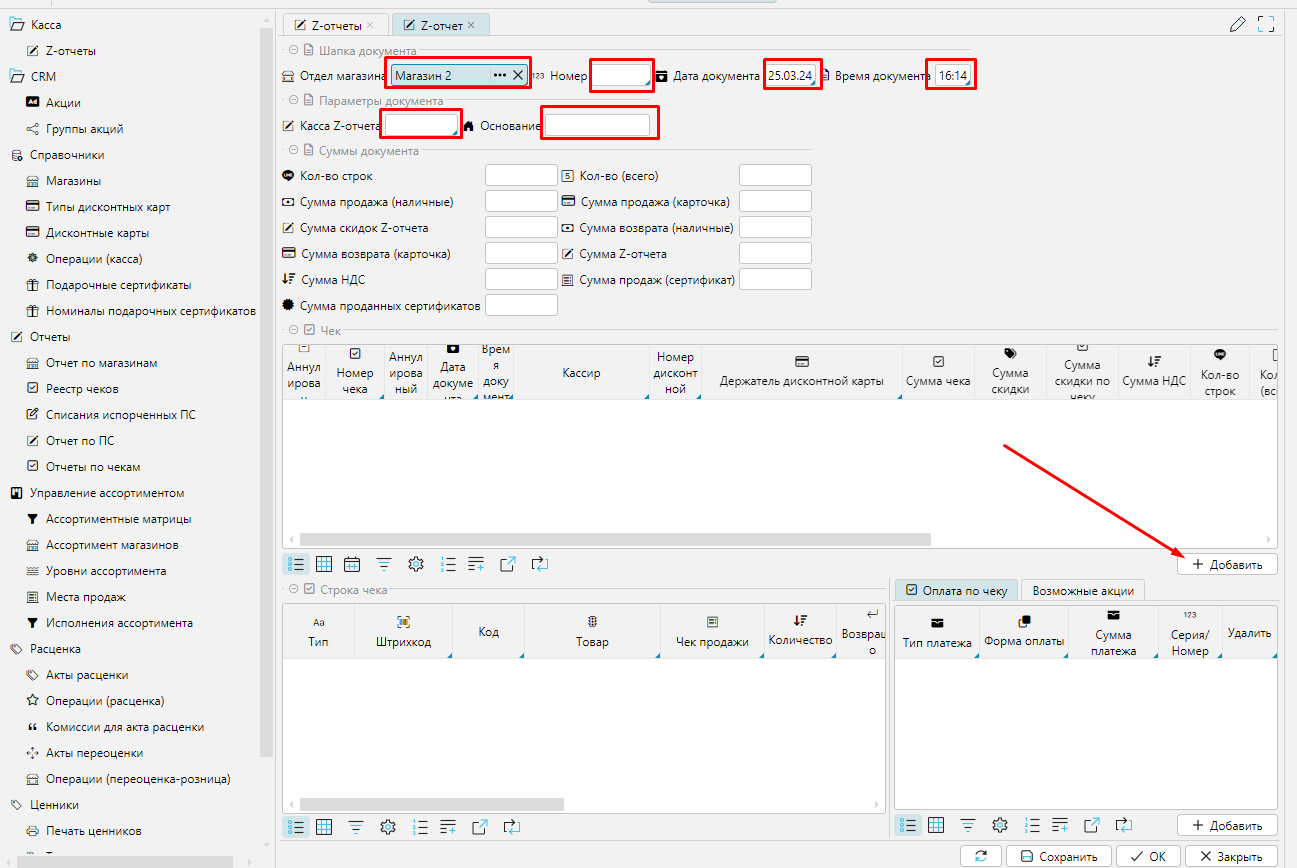 В ситуации когда выявлен некорректный чек продажи или формы оплаты есть возможности внести изменения на форме Z-отчеты модуля Розничная торговля: