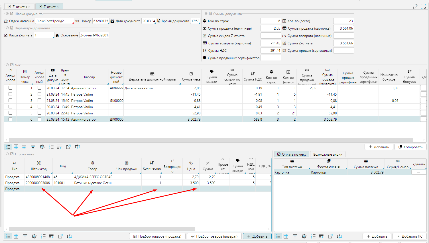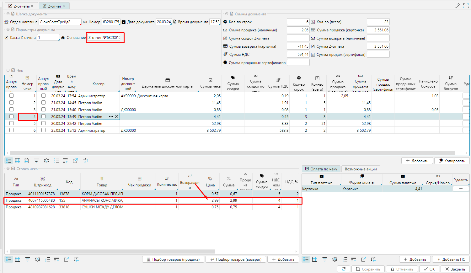 В открывшемся окне в верхней части находим необходимый чек, в нижней части находим нужную позицию