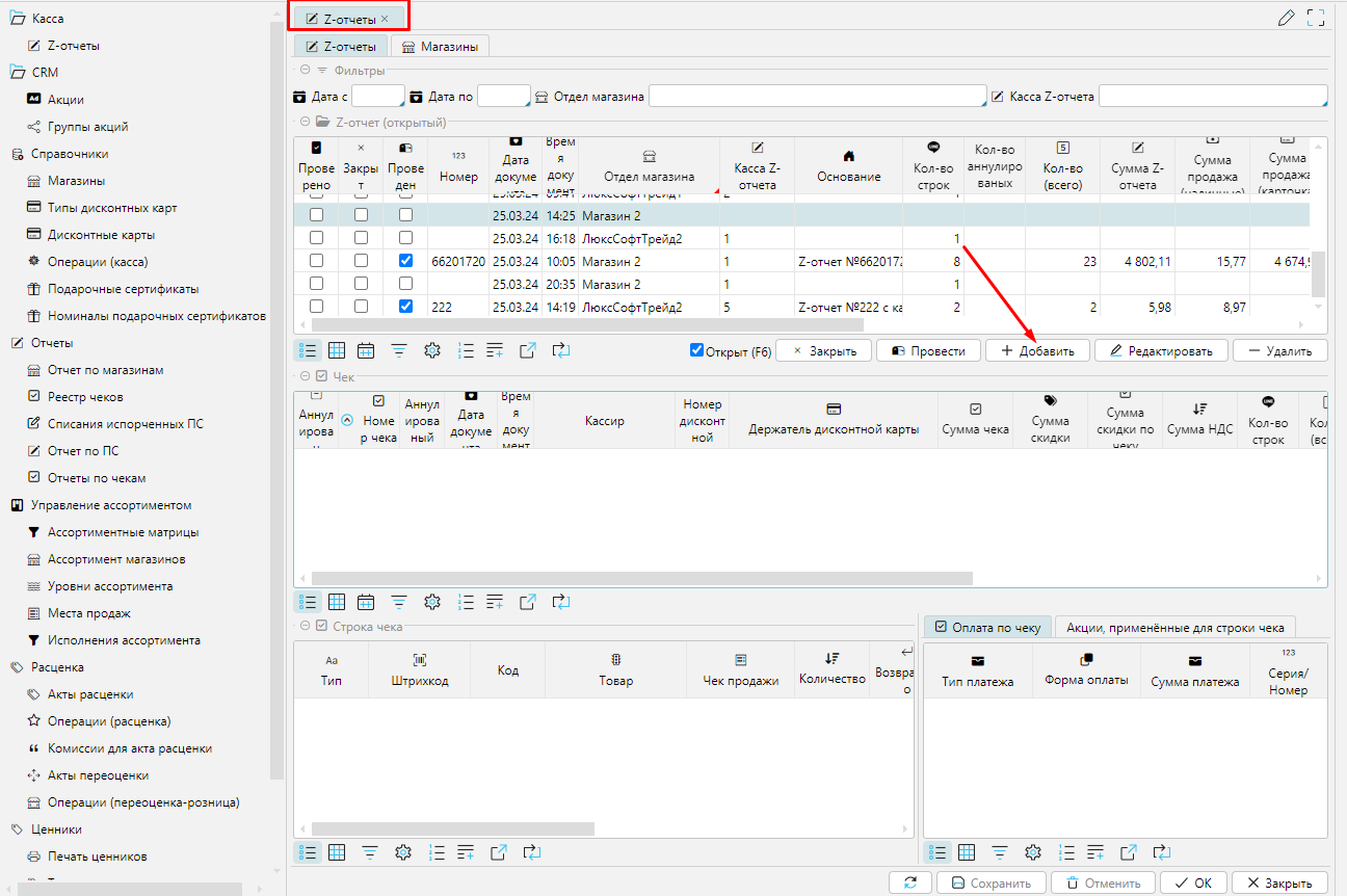Добавление нового Z-отчета можно осуществить на форме с помощью кнопки "Добавить"