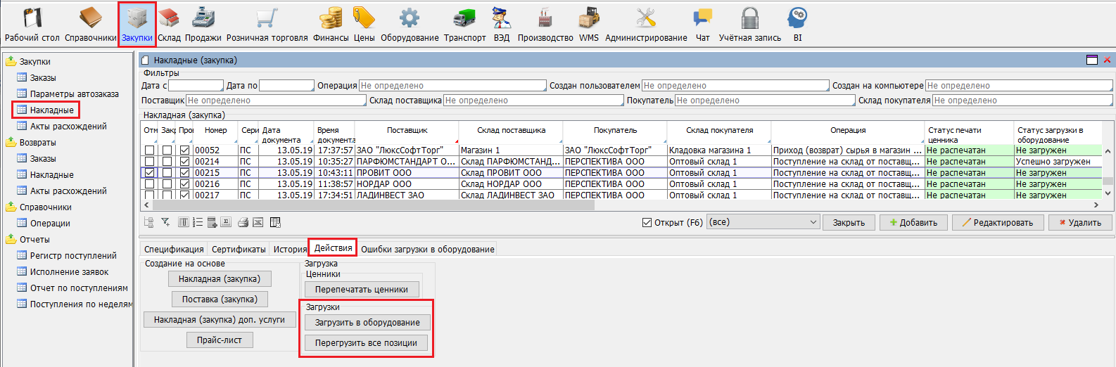 Основными формами, из которых совершается загрузка в оборудование являются: «Накладные (закупка)», «Акты переоценки», «Текущие остатки» – вкладка «Действия» (рис. 1.).